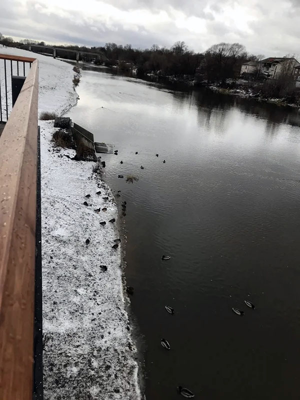 Зима. Уточки греются у коллектора. Нечистоты, сливающиеся в Клязьму прямо посреди раскинувшегося «пляжа», намного теплее воды в реке, вот ути и кучкуются около слива, чтобы не замерзнуть. Видимо, в этом и был потаенный смысл и сермяжная правда — забота о здоровье братьев наших меньших.